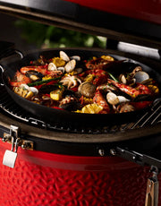 Expand the versatility of your Kamado Joe ceramic grill with the Paella Pan from our Karbon Steel collection and enjoy traditional, Spanish-styled paella in the comfort of your own home. The wide, shallow carbon steel cooking surface is designed to sauté meats and vegetables, while the perforations allow for rice to steam. The pre-seasoned, non-stick pan makes for an efficient cooking and clean-up experience while providing ultimate versatility.