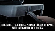 - Drop-down resin side shelves with integrated tool hooks